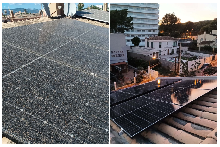 Antes y después de un trabajo de mantenimiento y limpieza de paneles por parte de Geneba Renovables en Mallorca.